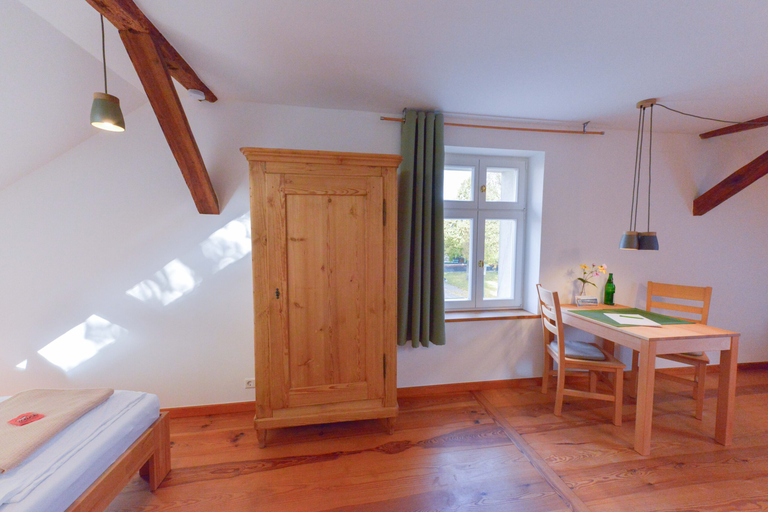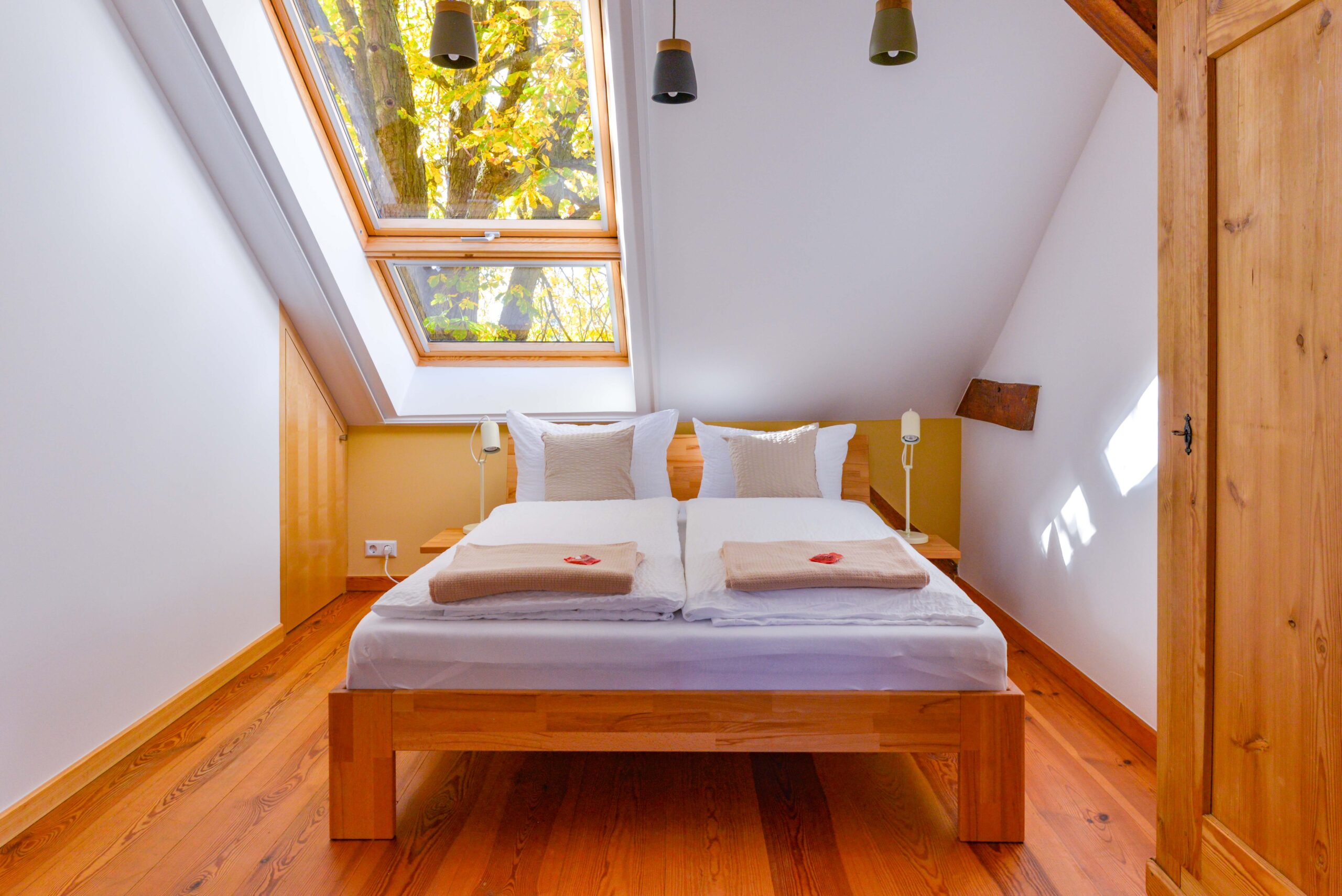 In diesem Sinne lädt unsere Wohnung Salbei zum Durchatmen und Ankommen ein. Sie ist im Loft-Stil gestaltet, mit einem offenen Wohnkonzept, das Leichtigkeit und Weite schenkt. Durch das große Dachfenster fällt der Blick direkt in die Krone einer alten Kastanie – je nach Jahreszeit ins zarte Grün, dichtes Sommerlaub oder goldene Herbstlaub. Ein Ort, der Geborgenheit und unmittelbare Nähe zur Natur vereint.